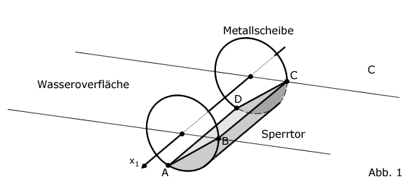 Die tiefste Stelle eines Schiffs bewegt sich im Modell auf der Gerade , . Beurteilen Sie anhand einer Rechnung, ob das Schiff das Sperrwerk passieren kann, wenn das Sperrtor geöffnet ist.
