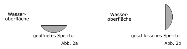 Ist das Sperrtor geöffnet, so liegt dessen rechteckige Seitenfläche unterhalb der Wasseroberfläche und ist parallel zu ihr (vgl. Abbildung 2a). Ist das Sperrtor geschlossen, so steht die Seitenfläche senkrecht zur Wasseroberfläche (vgl. Abbildung 2b).